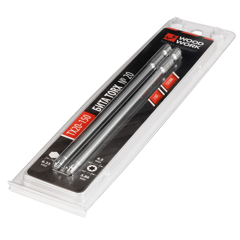 • бита WOODWORK TX20-150 имеет длину 150 мм и представляет собой продолговатое металлическое изделие с шестью гранями