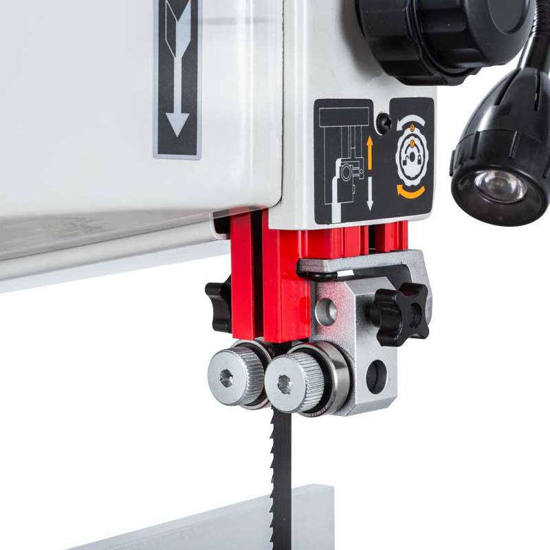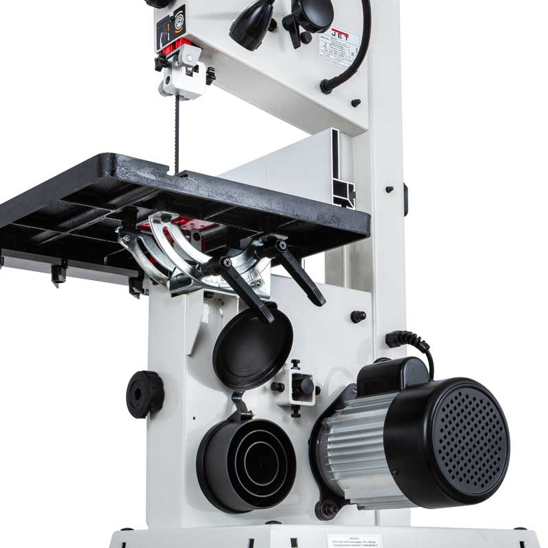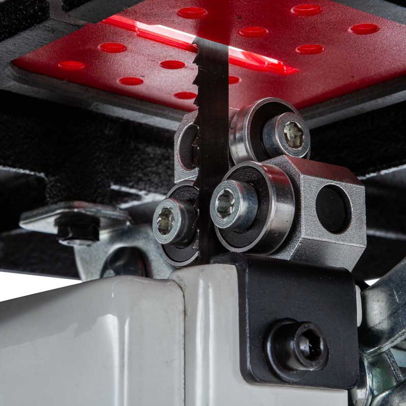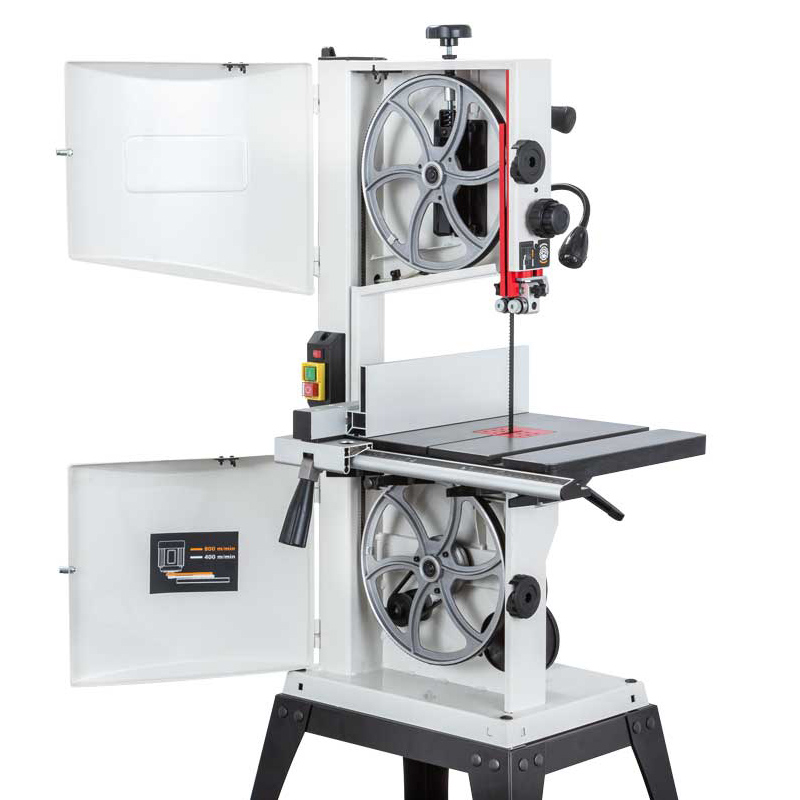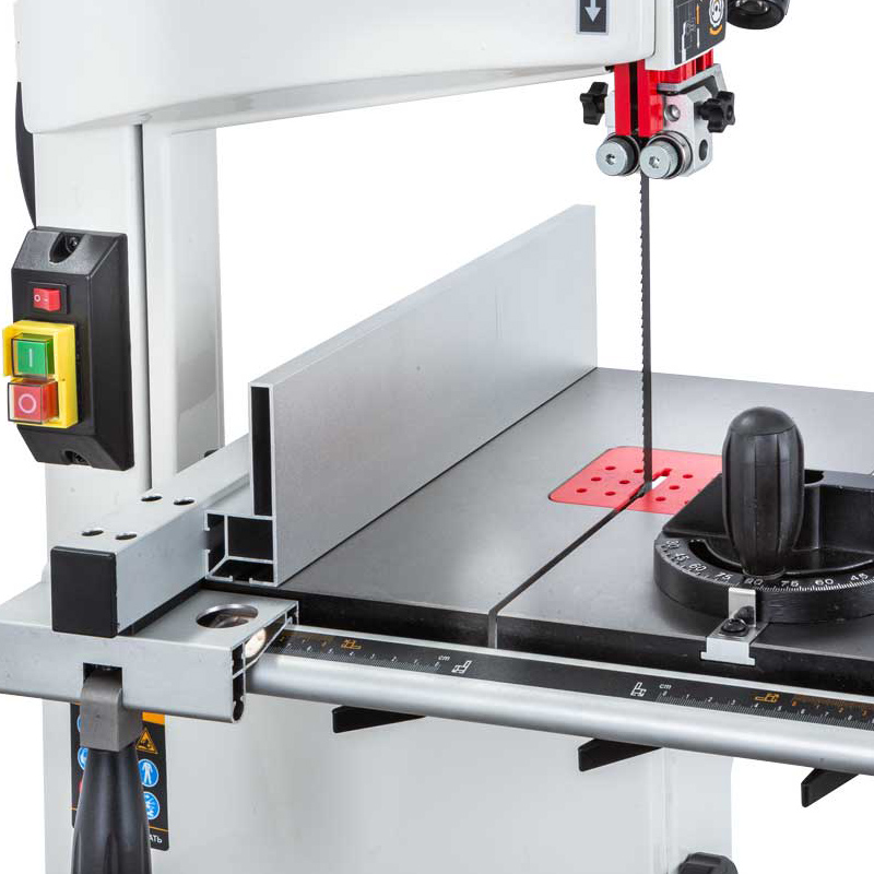 • станок оснащен трехточечными роликовыми направляющими, чугунным рабочим столом, возможностью выбора одной из двух скоростей и способен работать с заготовками значительных размеров, достигая в высоту 152 мм, а наклонный стол позволяет выполнять косые пропилы