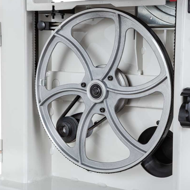• путем перестановки ремня можно снизить скорость пильного полотна с 800 м/мин, идеально подходящей для мягкой древесины, до 400 м/мин - это изменение предотвращает появление прижогов при обработке твердых пород дерева